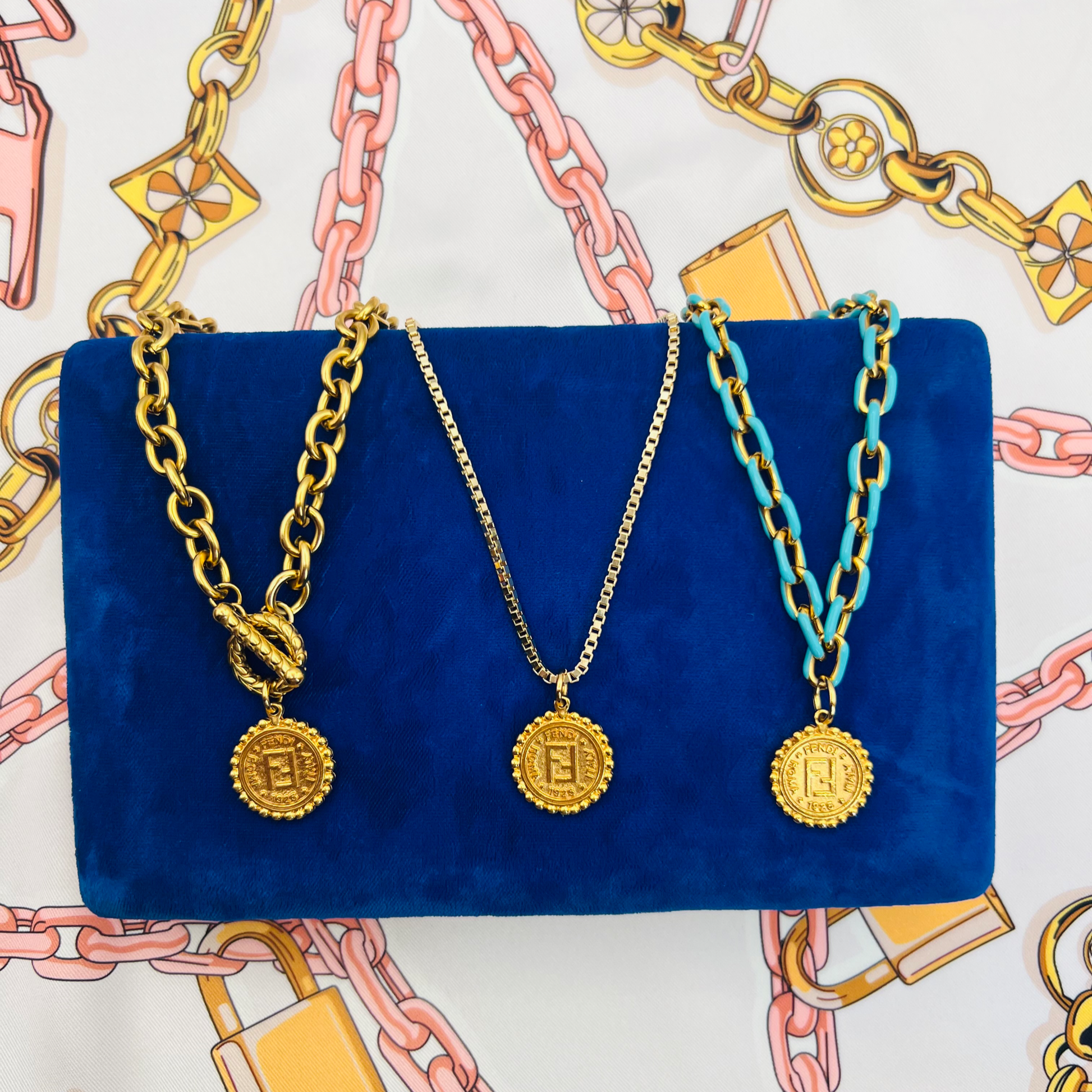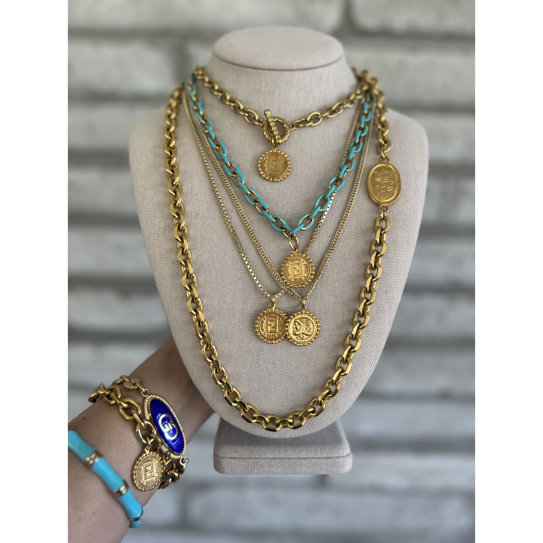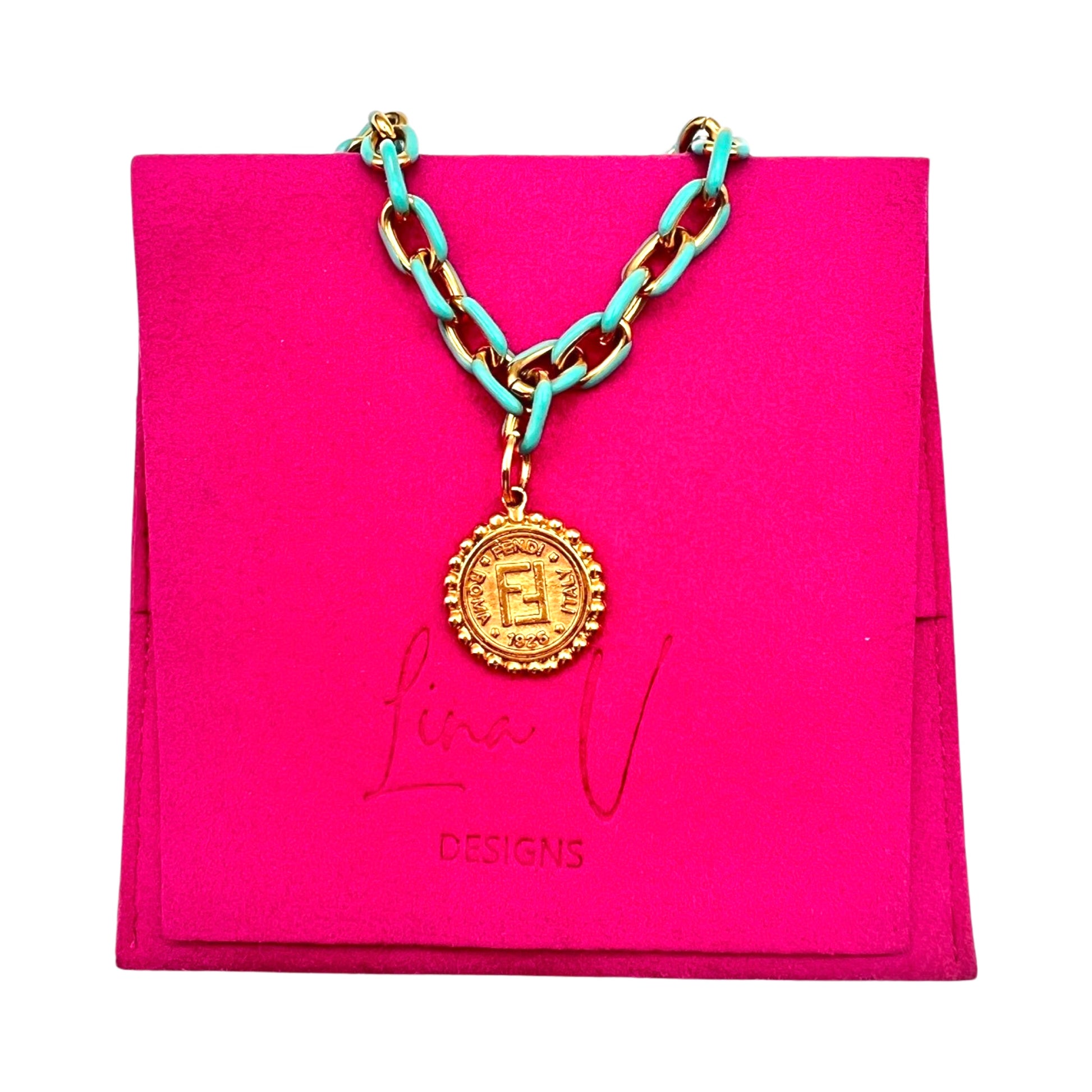 DISCLAIMER: All pieces are redesigned by Lina V Designs with repurposed designer and vintage pieces. Lina V Designs is NOT affiliated with any designers. Prices are solely determined by the chain, extra materials, time put into crafting and the rarity of the charm. Some pieces may have wear due to their authentic vintage condition.