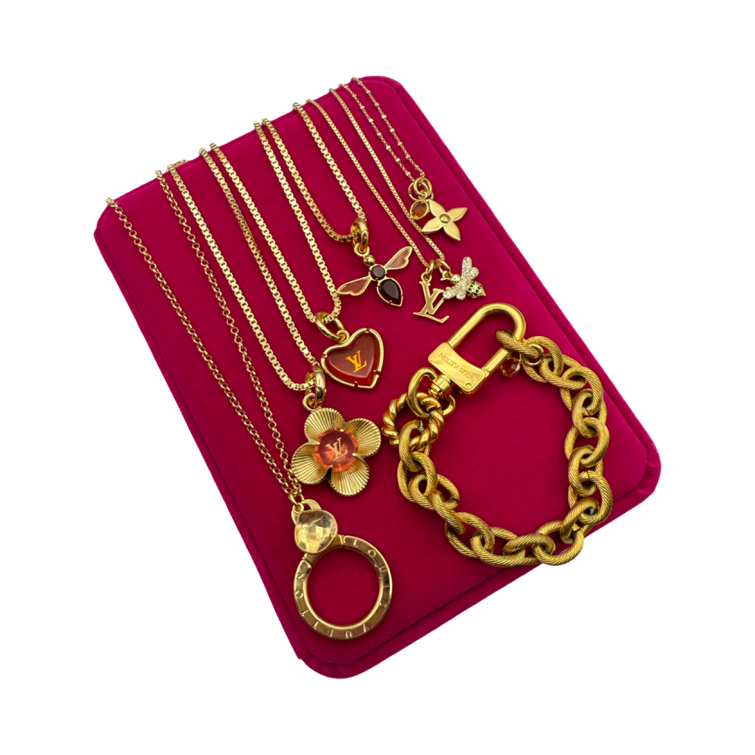 DISCLAIMER: All pieces are redesigned by Lina V Designs with repurposed designer and vintage pieces. Lina V Designs is NOT affiliated with any designers. Prices are solely determined by the chain, extra materials, time put into crafting and the rarity of the charm. Some pieces may have wear due to their authentic vintage condition.
